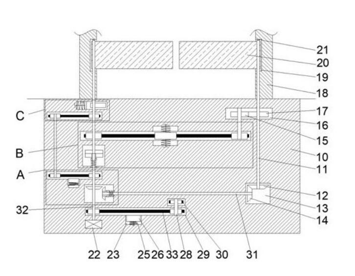 本发明涉及智能楼宇相关领域,公开了一种可根据人流量控制进出的安保装置,包括主箱体,主箱体的上端面固定连接有两个左右对称的刷卡箱体,刷卡箱体内设有开口向内的转动腔,主箱体内固定连接有电机,电机的上侧设有下侧带轮腔,下侧带轮腔的下侧连通设有下侧绷紧块腔,下侧带轮腔的右侧上方设有后侧传送带腔,通过对进出安保装置的人流量进行判断监控,来作为两种刷卡进出模式转换的依据,在进出人数较少时,预留的进出空间相较为宽裕,方便进出,当人流量处于高峰时段时,自动将进出空间一分为二,改排为两列进出,从而提高在高峰时段的刷卡进出效率,并且仍实施一卡一人的进出方式,提高效率的同时能够确认进出人员的身份。
