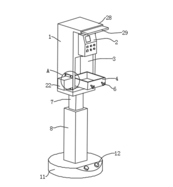 本实用新型公开了一种楼宇智能刷脸装置,其技术方案要点是:包括固定座和固定在所述固定座上的门禁机,还包括:凹槽,所述凹槽开设在所述固定座内;放置盒,所述放置盒转动连接在所述凹槽内;第一伺服电机,所述第一伺服电机固定在所述固定座外部驱动所述放置盒转动;挂钩,所述挂钩固定在所述放置盒的端侧;滑动柱,所述滑动柱固定在所述固定座底面;支撑筒,所述支撑筒位于所述滑动柱外部供所述滑动柱竖直滑动;驱动螺杆,所述驱动螺杆与所述滑动柱之间螺纹连接;第二伺服电机,所述第二伺服电机固定在所述支撑筒内用于驱动所述驱动螺杆转动;本楼宇智能刷脸装置具有方便使用、人性化程度高的优点。