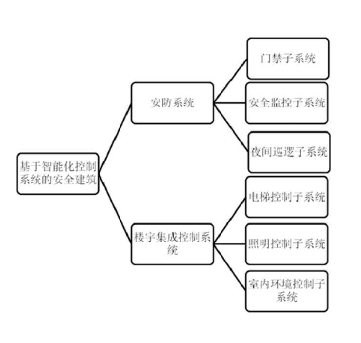 本发明公开了一种基于智能化控制系统的安全建筑,该安全建筑包括安防系统和楼宇集成控制系统,安防系统包括门禁子系统、安全监控子系统和夜间巡逻子系统,门禁子系统用于对人员的进出进行管理,安全监控子系统用于对建筑内外的主要出入口和通道的安全情况进行排查,夜间巡逻子系统用于对巡更人员进行考核管理,楼宇集成控制系统包括电梯控制子系统、照明控制子系统和室内环境控制子系统,电梯控制子系统用于对电梯的故障、安全隐患和电梯监控环境下的异常行为进行监控,照明控制子系统用于对建筑内外的照明设备进行控制,室内环境控制子系统用于对室内的温度和二氧化碳浓度检测并控制。本发明提升了建筑内外的安全性并减少了所消耗的能源。
