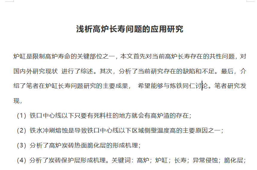 炉缸是限制高炉寿命的关键部位之一,本文首先对当前高炉长寿存在的共性问题,对国内外研究现状 进行了综述。其次,分析了当前研究存在的缺陷和不足。最后,介绍了笔者在炉缸长寿问题研究的主要成果, 希望能够与炼铁同仁讨论