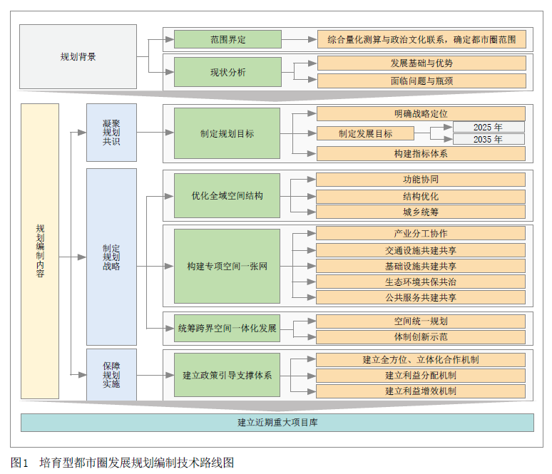 国内外学者在都市圈相关研究中一般将其空间演变划分为若干个阶段。弗里德曼在“经济增长引起空间演化”的理论中,将城市群的形成分为四个阶段;斯科特从区域中心城市与外围地区的关系出发,将区域空间结构的演化分为单中心、多中心、网络化三个阶段;程大林等人基于区域空间联系方式与程度的变化,将都市圈的发展阶段分为低水平均衡发展、低水平极化、高水平均衡发展和高水平极化四个空间演化阶段;陈小卉从都市圈规划编制的角度,将我国都市圈分为雏形期、成长期、成熟期三个阶段,提出三个阶段的重点目标分别是培育、发展和协调。从上述相关研究可以发现,都市圈的空间演变一般经历要素向中心集聚、由中心向外围扩散、新中心生长和形成区域网络等阶段,各发展阶段与中心城市的发展能级直接相关。