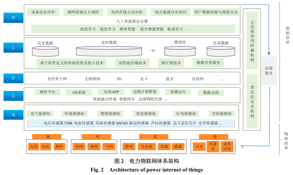 随着“碳达峰、碳中和”目标与以新能源为主体的新型电力系统的提出,能源技术与数字技术进一步深度融合,电网加速向能源互联网演进。构建能源互联网及其数字孪生系统对电力物联网技术提出了更高要求,也极大拓展了电力物联网的内涵和外延。该文主要围绕如何构建面向能源互联网数字孪生系统的电力物联网,分析其面临的两大科学问题:物理数字融合建模与电网资源协同互动,提出电力物联网体系架构和安全防御机制,研究“端–边–管–云–智”等多层级的关键支撑技术,包括精准感知与高效通信、高并发接入与海量数据管理、融合建模与趋优进化等技术,最后从设备、电网与用户三方面展望电力物联网支撑下的电网业务智能化典型应用。