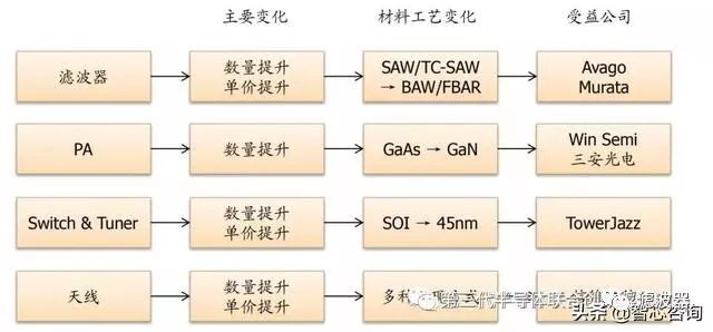 (1)滤波器(Filter)(2)功率放大器(PA),(3)通信基带芯片(Baseband)等是主要受益器件。海外企业建议关注 Skyworks、Qorvo、Murata、Broadcom及代工厂商 TowerJazz、稳懋。国内公司建议关注拥有化合物半导体代工能力的三安光电,手机天线厂商信维通信,以及中国厂商在滤波器等器件上的突破