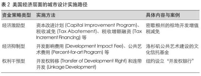 美国城市设计实施通过四个方面的作用方式和技术手段,形成了一套控制性强、操作性高、协调性好及民意性优的实施体系:①法律层面,依托于以区划法为核心的相关法律体系;②行政层面,通过城市设计审议程序进行运作;③公众参与,充分体现自下而上的城市建设组织模式;④经济层面,通过资金激励与抑制策略促进公私合作,促进城市建设资本市场的发展,增强实施的可操作性。