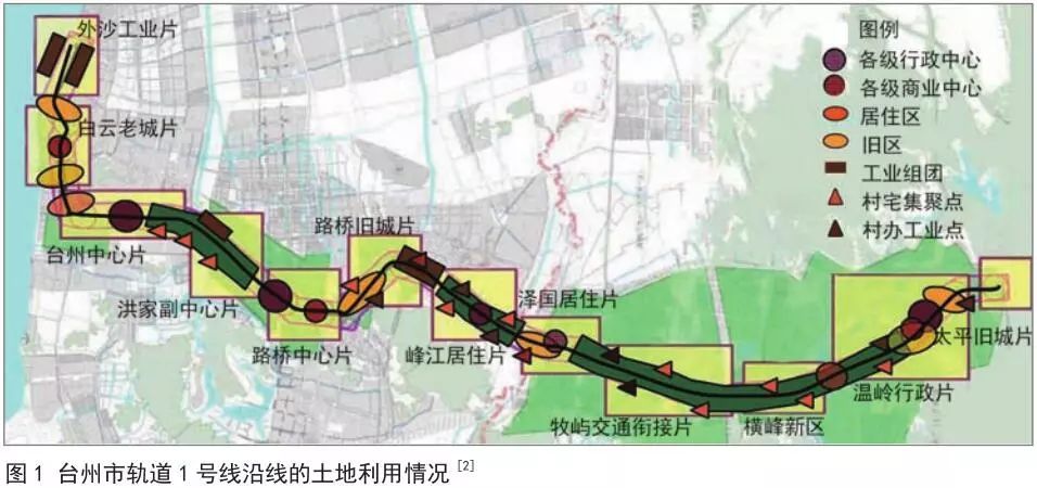 我国正处于轨道交通规划建设的高峰期,轨道运营效率及所承载的服务功能越发受到社会各界的重视,轨道线路所覆盖的城市功能单一、潮汐式客流明显等是轨道城市发展过程中无法忽视的问题,而目前尚缺乏有效应对策略。调查显示,沈阳市轨道交通1号线、上海市轨道交通5号线和广州市轨道交通4号线等轨道线路出现了轨道规划与沿线土地利用失衡、实施进程与轨道交通不配套,以及城市功能脱节、客流不均衡等情况。以台州市为例,其轨道交通1号线沿线的土地利用呈现出典型的异化组团布局特征(图1),组团间功能布局“各自为政”,在12个功能节点内相对均衡的分布着各区的新旧行政中心、商业商务中心。全线未形成主次分明、分工明确、功能互补的功能区,导致线路上的部分站点出现使用率低、开发强度小、土地及相应设施重复配置严重等问题。这些矛盾若得不到有效应对,将会造成城市资源的巨大浪费。