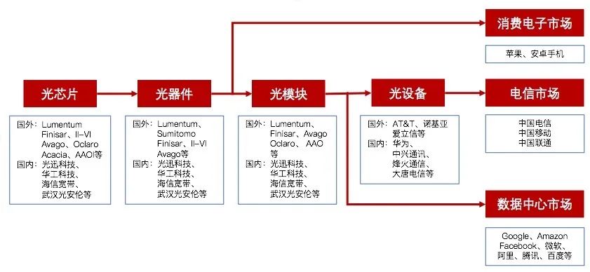 光芯片属于技术密集型行业,具有极高的技术壁垒和复杂的工艺流程。因此,光芯片在光器件/光模块中成本占比较大。此外,随着芯片速率的提升,制备难度增大,成本占比或进一步提升。一般情况下,对于低速率光模块/光器件(转换速率小于10Gbps ),光芯片的成本占比约为 30% 左右; 而对于高速光模块/光器件(调制速率大于25Gbps ), 芯片的成本占比约为60%左右。例如,全球数通光模块龙头中际旭创 (公司主力产品为100G QSFP28,采用 25G 光芯片),整体光芯片及组件成本占比在50%左右。