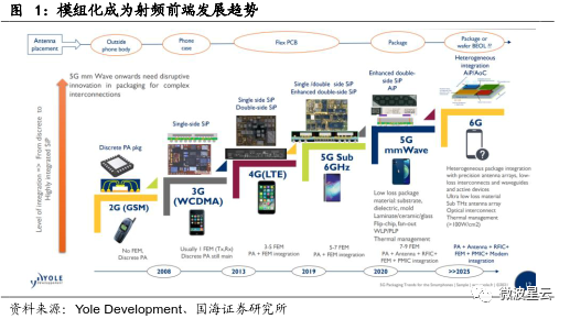 射频前端模组化趋势显著。5G 通信技术引入新的频段应用,同时复杂技术和新应用的不断出现,导致了射频前端器件数量大幅增加。为了适应智能手机轻薄化和降低成本的需求,射频前端的集成度也将会逐渐增加,模组化的趋势越来越明显。