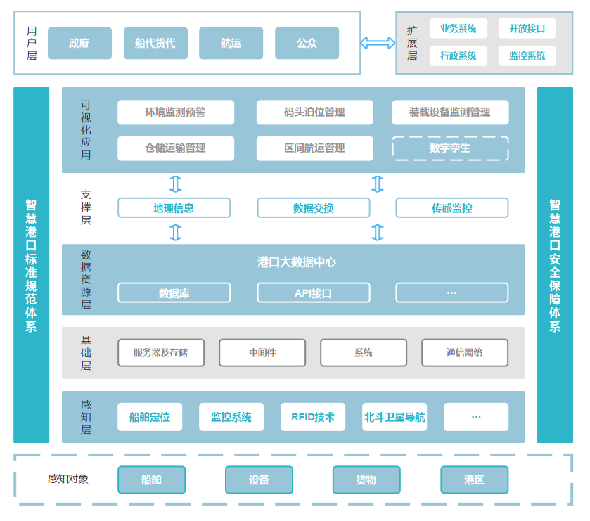 随着我国经济与贸易的不断发展,我国港口基础设施建设与技术能力已位于世界领先水平,越来越多的港口开始注重5G、物联网、大数据、云计算、智能感知等前沿信息技术,在区域范围内建立“智慧型”信息枢纽,实现功能、技术和服务的转型升级,全面构建“智慧港口”,使物与物、物与人、人与人以及港口物流的各种资源和各参与点能实现广泛地互联互通。