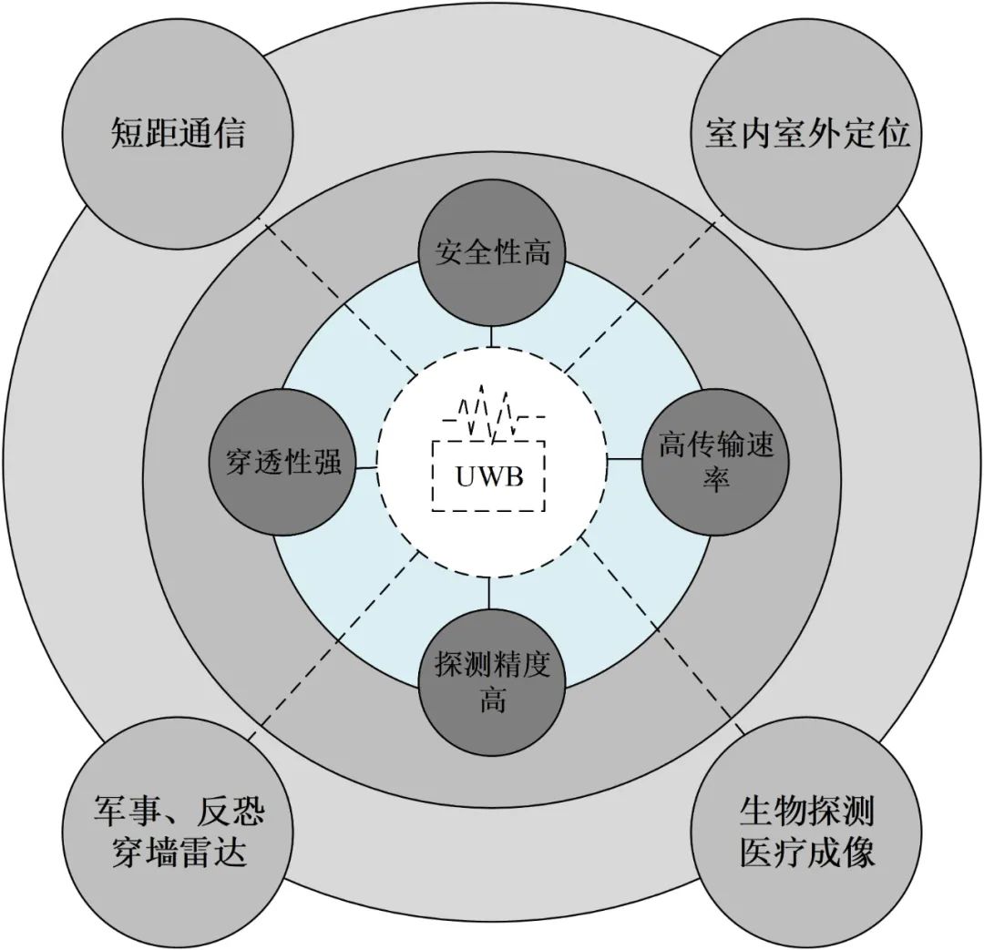 2002年2月,美国联邦通信委员会(Federal Communications Commission,FCC)正式批准超宽带民用,规定超宽带的工作频率为3.1~10.6 GHz,发射带宽大于500 MHz,但为了防止超宽带与其他通信带宽产生干扰,对发射机发射功率进行了限制,即有效全向辐射功率小于–41.2 dBm/MHz。因此超宽带技术的高速传输速率是以非常宽的带宽为代价,同时超宽带脉冲雷达技术是发射机发射持续时间极短的脉冲信号,而收发机的重频周期较长,因此单位时间内消耗的功耗极低,适合今后低功耗的应用场景要求。