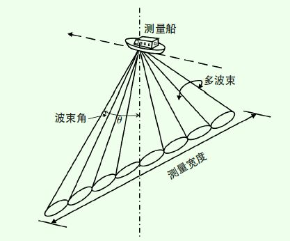 多波束测深系统也称为条带式测深系统,是利用声波在水体的传播特性来测量水深的一种声学探测技术。该系统利用安装于测量船底部的声学换能器阵列,按照一定的角度向海底发射超宽声波波束,并接收海底反向散射的回波信号,根据各角度反射声波到达接收换能器的时间和相位,经过信号解算得到多个探测点的水深值,这是一个主动识别和进行异常校正的测深过程,其水深测量值是根据发射声波探测海底的往返时间与声波在海水中的传播速度来确定。