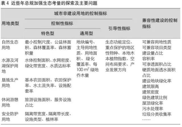 总规作为指导城市发展与建设的总体蓝图,是城市建设和规划管理的法定依据,是城市规划的“龙头”,在城市发展过程中起着至关重要的整体调控作用。概括起来,依据《城乡规划法》与《城市规划编制办法》,一般总规的主要内容包括确定城市性质与职能、城市规模、城市发展方向、总体用地布局、功能分区和道路交通等,笔者将其核心内容归纳为“一图、一表、两规模”,“一图”即用地布局规划图,“一表”即规划用地平衡表,“两规模”即城市人口规模与用地规模。其中,“一图”与生态有关的主要内容包括用地适宜性评价、绿地系统规划及空间管制中的“三区四线”划分;“一表”与生态有关的内容主要就是绿地比例及人均绿地面积;“两规模”与生态有关的内容是“理应”基于生态承载力预测的城市规模;另外,还有关于环境治理的环境保护规划等。