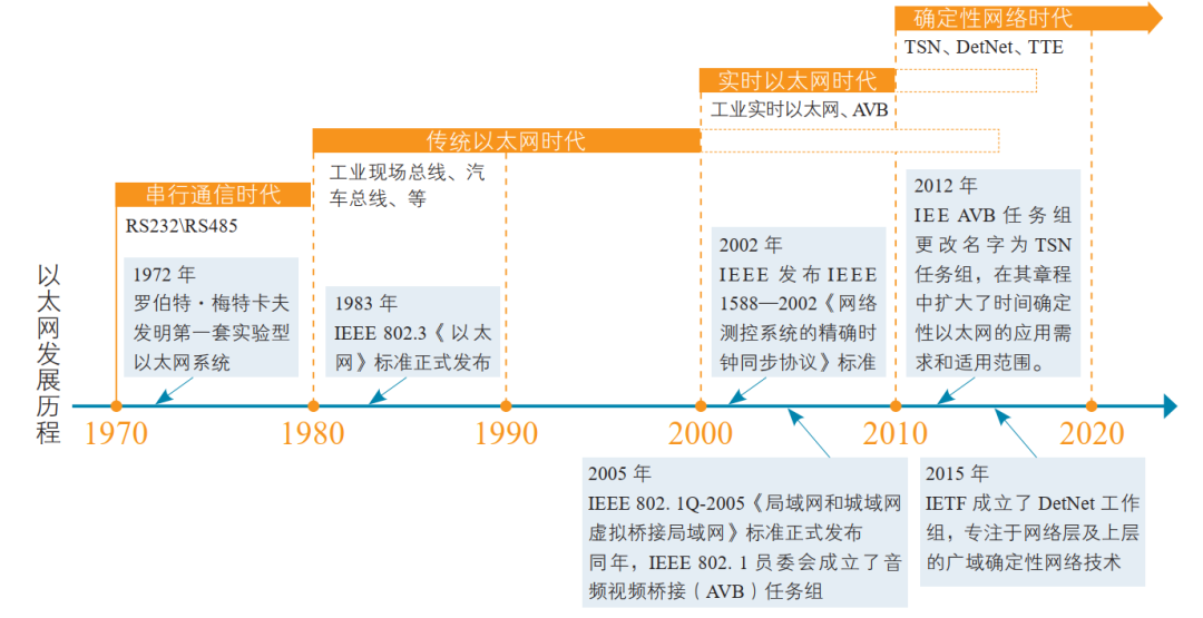 TSN(Time Sensitive Network,时间敏感网络)是由IEEE 802.1 TSN任务组制定的一系列IEEE 802以太网子标准集,该任务组成立于2012年,由IEEE 802.1 AVB(audio video bridging,音视频桥接)任务组改名而成。AVB工作组致力于解决音频视频数据在以太网介质上传输时的时延较高、抖动较大、传输不确定等问题。TSN通过无缝冗余等机制扩展了AVB技术的性能,为网络提供有界低时延、低抖动和极低数据丢失率的能力,使得以太网能适用于可靠性和时延要求严苛的时间敏感型应用场景。