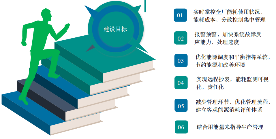 智慧能源管理实现实时掌控全?能耗使?状况,能耗成本,分散控制集中管理,报警预警,加快系统故障反应能?,处理速度,优化能源调度和平衡指挥系统,节约能源和改善环境,实现远程抄表,能耗监测可视化,责任化,减少管理环节,优化管理流程,建?客观能源消耗评价体系,结合?能量来指导?产管理。