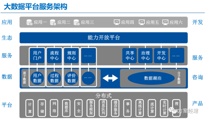 大数据平台的整体架构可以由以下几个部分组成: 一、业务应用:其实指的是数据采集,你通过什么样的方式收集到数据。互联网收集数据相对简单,通过网页、App就可以收集到数据。