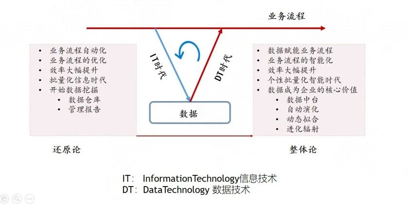 什么叫 DT 时代?Data Technology,就是用数据记录这个时代。当你在 IT 时代做到最后的时候,所有的系统都被自动化的方法实现之后,就沉淀了大量的数据,比如说我们做营销,我们就看到了很多客户的交易数据。我也知道这个客户他有什么喜好,对吧?我是银行,我会看他的交易数据,这个数据看了之后累计在这个地方,数据里面就有大量的信息要去挖掘。那我们现在如何来解读这个数据?那从这里面我们就能挖掘出来很多有用的知识,把这个有用的知识我重新赋能到业务流程里去。