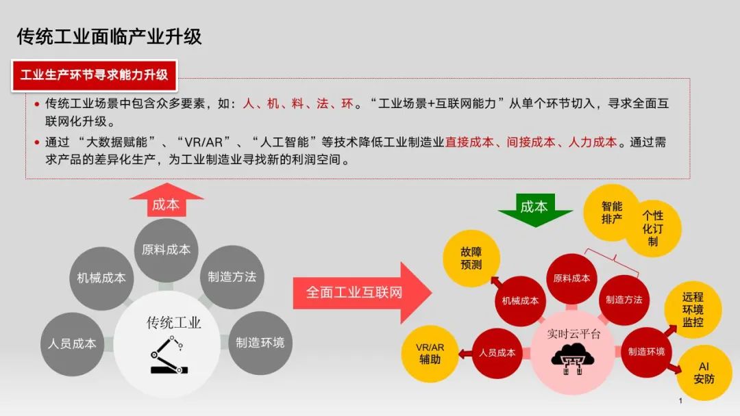 工业生产环节寻求能力升级。传统工业场景中包含众多要素,如:人、机、料、法、环。“工业场景+互联网能力”从单个环节切入,寻求全面互联网升级。通过“大数据赋能”、“VR/AR”、“人工智能”等技术降低工业制造业直接成本、间接成本、人力成本。通过需求产品的差异化生产,为工业制造业寻找新的利润空间。