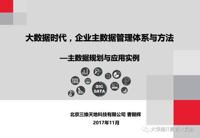大数据时代,数据已成为企业的核心资产和重要战略资源,越来越多企业利用主数据管理手段对核心数据进行分析,从而获得最大限度的价值。近日,大华南IT高管共赢圈邀请了北京三维天地科技有限公司数据标准化资深专家曹朝辉先生作微课分享,与大华南平台CIO分享企业主数据管理体系与方法以及主数据规划与应用案例。