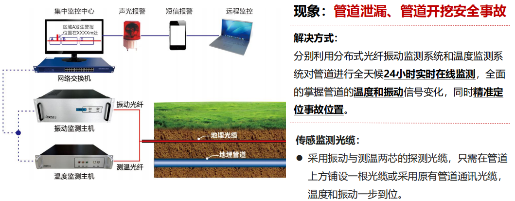石化行业智能光纤安全监测系统,利用分布式光纤振动监测系统和温度监测系 统对管道进行全天候24小时实时在线监测,全面的掌握管道的温度和振动信号变化,同时精准定位事故位置。
