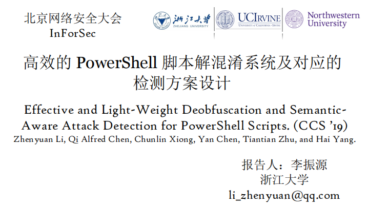 我们针对攻击者常用工具 PowerShell 的混淆难题, (1) 通过对抽象语法子树细粒度的分析,准确定位混淆片段; (2) 利用混淆脚本自身逻辑进行解混淆,减少了手工分析的工作,可以处理未知混淆,提高了鲁棒性; (3) 最后将混淆检测、解混淆逻辑、验证三个阶段有机的结 合在一起,可以处理多层混淆。实现了第一个轻量且有效的 PowerShell 解混淆系统。有效的提升了解混淆后脚本的检测精度。