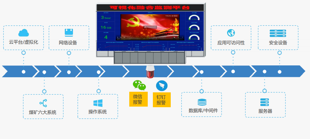 随着近几年煤炭行业信息化的发展,煤矿的信息化系统已经涵盖了云平台、虚拟化、六大系统、OA办公等系统,又涉及到很多硬件设备,如服务器、工控机、存储、网络设备、安全设备,煤矿对信息化系统的稳定性要求越来越高,这就意味着煤矿绝对不允许出现系统宕机或者暂停服务的情况,所以在对信息化系统要求高度稳定的当下,可视化自动运维平台应运而生,可以实现对煤矿信息化系统的实时监测与性能评估。