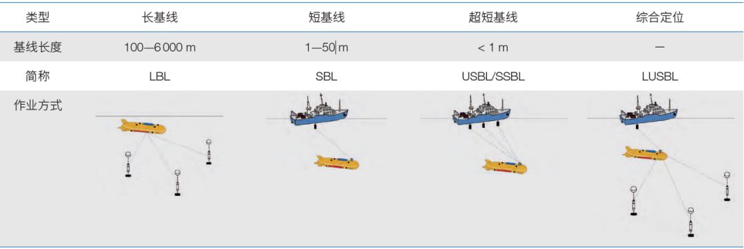 根据定位系统基线长度以及工作模式的差别,一般将其划分为长基线系统、短基线系统、超短基线系统及综合定位系统(表1)。①长基线定位系统由预先布设的参考声信标阵列和测距仪组成,通过距离交汇解算目标位置。长基线需要事先测阵,作业成本高,主要应用于局部区域高精度定位。②超短基线定位系统则是由多元声基阵与声信标组成,通过测量距离和方位定位。其优点为尺寸小、使用方便;缺点是定位误差与距离相关,仅适用于大范围作业区域跟踪。③短基线定位系统由装载在载体上的多个接收换能器和声信标组成,通过距离交汇获得目标位置。短基线作业简便,但其精度易受到载体形变等因素影响。④综合定位系统融合了超短基线及长基线定位,兼顾了超短基线作业的简便性和长基线的定位精度。