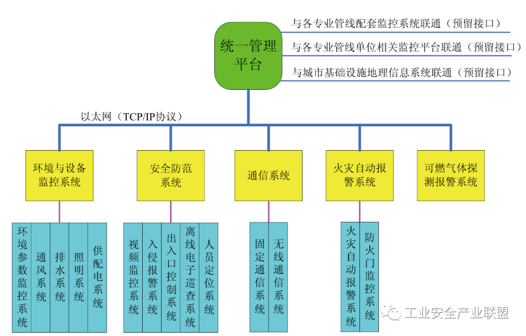 近年来,城市综合管廊作为市政行业一项新兴的工程类别,建设项目逐年增多。综合管廊亦称共同沟,是一种集给水、雨水、污水、再生水、天然气、热力、电力、通信等各种市政管线于一体,同时设置专门的检修口、吊装口、排水设施、消防设施、通风设施和监测控制系统的地下集成化隧道,实行“统一规划、统一建设、统一管理”,以做到地下空间的综合利用和资源共享[1~3]。综合管廊是城市的超级大动脉,作为城市关键基础设施,其工业控制系统信息安全需要重点关注。基于管廊自身特点,为了保证管廊正常运行及人员安全,应建立综合管廊监控与报警系统、工业控制系统信息安全策略,借助自动化、信息化技术,有效提升综合管廊的运行管理自动化水平。