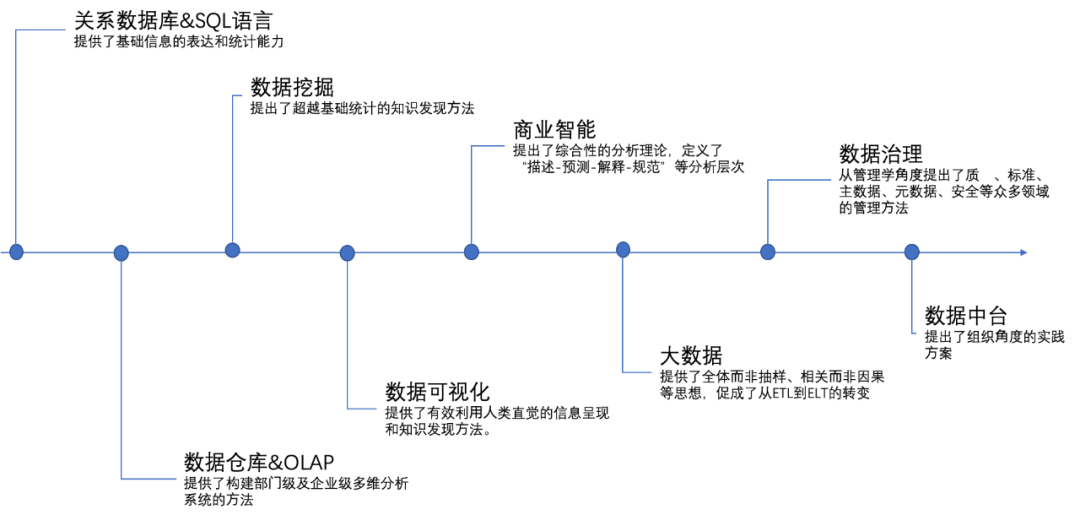 数据生产力的愿景是构建“人人用数据,时时用数据”的企业数据文化,愿景代表的是目标和方向,支撑这个目标的达成,必然需要一系列的方法论。方法论,是以解决问题为目标,通过对具体方法的分析和总结,提出的一般性原则。方法论可以指引技术的发展方向。很多从事数据分析的人,容易沉溺于技术实现,而忽视技术背后的方法论。在数据分析的历史上,其实诞生过很多优秀的方法论,这些方法论指导了数据分析技术的不断演进和迭代。