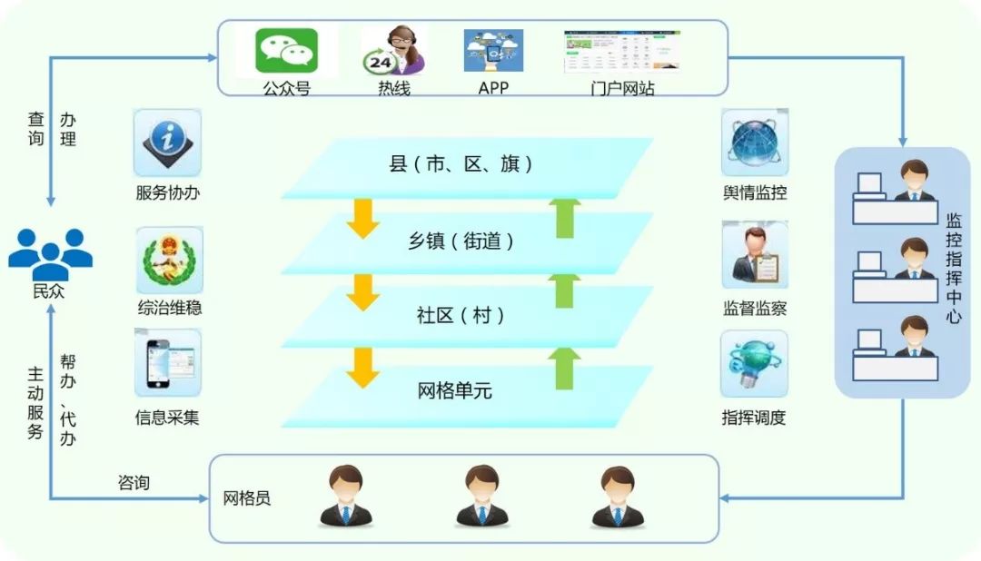网格化管理就是根据属地管理、地理布局、现状管理等原则,将管辖地域划分成一个个的“网格”,并对每一网格实施动态、全方位管理(参考百科)。网格化管理最初是用于电子信息技术领域,后来逐渐被引用并加以改造成为一种政府管理等领域的新模式和新方法。网格化管理是将人、地、物、组织纳入网格管理,缩短与客户间的服务距离,提高对客户需求的响应速度。