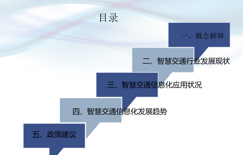 智慧交通:是将物联网、互联网、云计算、大数据为代表 的智能传感技术、信息网络技术、通信传输技术和数据处理技 术等有效地集成,并应用到整个交通系统中,在更大的时空范 围内发挥作用的综合交通体系。