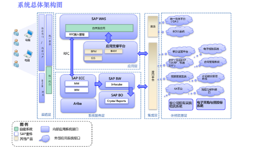基于中国移动的IT现状和整体业务需求考虑。本应用架构设计采用SAP套装软件支持关键业务功能(如采购,仓库,系统管理)。基于的理由是: SAP 套装软件与应用服务器拥有稳定的核心运行引擎,系统扩张性强,有完善的技术支持。但是由于本身SAP软件的界面友好性较差,与中国移动对于用户体验的需求有所差异,本架构界面采用基于J2EE的规范的Webdynpro For Java技术提供丰富的用户体验与友好的界面。