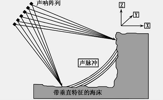 水下探测所使用的多波束声呐系统,从波束形成原理上可分为两种类型,一种采用束控法,称之为传统多波束,另一种采用相干法,可称之为相干多波束系统。本文所讨论的C3D测深侧扫声呐系统即为后者,其换能器在进行一次短脉冲发射后,海底反射的回波信号被换能器的接收器按照一定的相位差接收,根据相干原理,换能器阵中两个固定间距的换能器之间的相位差和波束的到达角存在固定的关系,从而计算出到达角的大小,再结合记录的波束传播时间即可进行水下目标位置的解算。