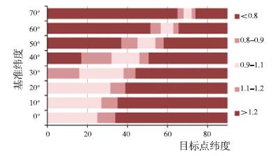 海洋基础地理数据由系列比例尺数据组成,每一固定比例尺数据能出版对应比例尺的纸质海图、电子海图等产品。海洋基础地理数据编制最常用的投影是墨卡托投影。基础数据编制首先根据要求设定数据墨卡托投影和编辑比例尺,然后依据海图制图要素综合指标进行制图综合,最后将制图综合结果入库[3-4]。墨卡托投影的变形规律为:在两条基准纬线上无变形;在两条基准纬线之间,长度比小于1,为负向变形;在两条基准纬线之外,长度比大于1,为正向变形;越接近两级点,长度变形越大,极点处长度比为无穷大;面积比是长度比的平方,面积变形更大,产生失真现象。在比例尺一定条件下,墨卡托投影选择不同的基准纬线,综合指标对应的实际距离也不同[6-8]。例如比例尺为1:10万,墨卡托投影基准纬线30°,浅于20m的海区水深注记的密度为10~15mm。在赤道上,对应实地距离850~1300m;在30°纬度上,对应实地距离1000~1500m;在60°纬度上,对应实地距离1700~2600m。