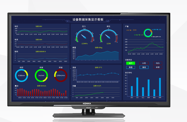 工业数据显示看板是管理可视化的一种表现形式,即对数据、情报等的状况一目了然地表现,主要是对于管理项目、特别是情报进行的透明化管理活动。它通过各种形式如 LED看板、警灯、语音播报、短信发送等把设备或现场等隐藏的情报揭示出来,包括温度、压力、转速、液位、长度等,以便任何人都可以及时掌握管理现状和必要的情报,从而能够快速制定并实施应对措施。因此,管理看板是发现问题、解决问题的非常有效且直观的手段,是优秀的现场管理必不可少的工具之一。
