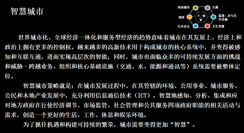世界城市化、全球经济一体化和服务型经济的趋势意味着城市在其发展上、经济上和政治上拥有更多的控制权。越来越多的高新技术用于构成城市的核心系统中,并变得被感知和互联互通,进而实现高层次的智能;同时,城市也面临众多的可持续发展方面的挑战和威胁–跨越业务、组织和核心基础设施(交通、水、能源和通讯等)系统需要被整体定位。 智慧城市策略就是:在城市发展过程中,在其管辖的环境、公用事业、城市服务、公民和本地产业发展中,充分利用信息通信技术(ICT),智慧地感知、分析、集成和应对地方政府在行使经济调节、市场监管、社会管理和公共服务四项政府职能的相关活动与需求,创造一个更好的生活、工作、休息和娱乐环境。 为了抓住机遇和构建可持续的繁荣,城市需要变得更加“智慧”。