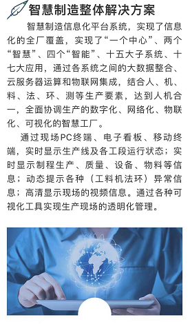 智慧制造信息化平台系统,实现了信息化的全厂覆盖,实现了“一个中心”、两个“智慧”、四个“智能”、十五大子系统、十七大应用,通过各系统之间的大数据整合、云服务器运算和物联网集成,结合人、机、料、法、环、测等生产要素,达到人机合一,全面协调生产的数字化、网络化、物联化、可视化的智慧工厂。 通过现场PC终端、电子看板、移动终端,实时显示生产线及各工段运行状态;实时显示制程生产、质量、设备、物料等信息;动态提示各种(工料机法环)异常信息;高清显示现场的视频信息。通过各种可视化工具实现生产现场的透明化管理。