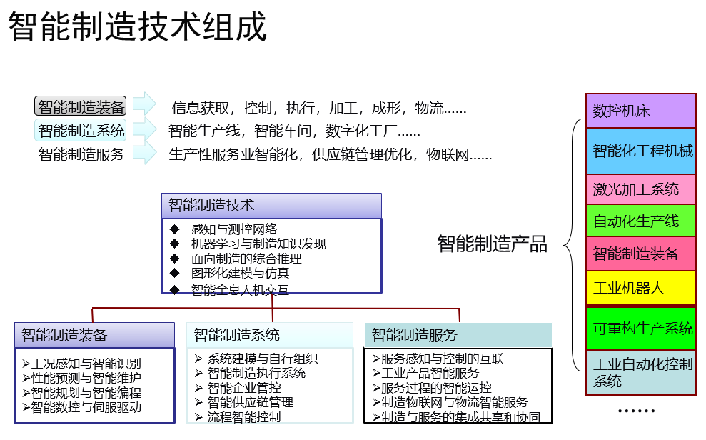 智能制造技术是在现代传感技术、网络技术、自动化技术、拟人化智能技术等先进技术的基础上,通过智能化的感知、人机交互、决策和执行技术,实现设计过程、制造过程和制造装备智能化,是信息技术和智能技术与装备制造过程技术的深度融合与集成。