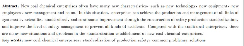 新建新型煤化工企业往往具有新工艺、新技术、新设备、新员工、新管理等诸多新特点,安全管理面 临巨大挑战,稍有不慎就可能发生事故。在这种形势下,企业通过开展安全生产标准化建设,实现生产 经营各环节的管理系统化、科学化、规范化,并持续改进,提升安全管理水平,预防各类事故发生。新建 新型煤化工企业的标准化创建工作相较于传统企业有很多新情况、新问题,针对该类企业安全生产标准 化创建工作中的常见问题及解决方案进行探究。