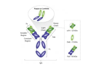 单克隆抗体是单特异性抗体:Y 型多结构域蛋白,带有两条轻链(κ或λ)和两条重链(如下图 1)。目前正在 研究和在临床中使用新型的抗体样分子:抗体片段。它们是较小的分子,对目标抗原具有相似的高亲和力,但(由于其大小) 可以更容易地穿透组织,包括在某些适应症中穿过血脑屏障。不同类型的片段包括片段抗原结合(Fab),单域抗体(dAb)和 单链 Fv(scFv)片段。具有两个活性结合位点(有时基于抗体片段)的双特异性抗体是另一种引起越来越多关注的产品。