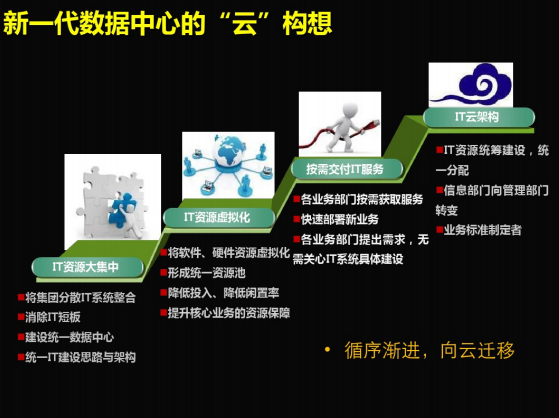 服务器存储、计算技术的迅速发展,早期建设的机房基础设施面临改造,重建。迫切需要一种先进的基础设备来支撑。同行业内的产品供应商纷纷提出系统集成解决方案如施耐德的NCPI.艾默生的E睿、科士达的整体解决方案、科华云动力、华为的模块化机房、以及IBM、HP的云计算解决方案