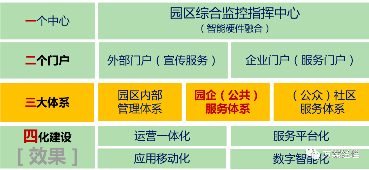 根据智慧园区理念以及园区一体化的服务需求,充分应用大数据、云服务、物联网、互联网等先进技术,以“园区运营服务”为建设核心,打造基于“一个中心”、“两个门户”、“三个体系”、“四化建设”、 的科技创新智慧园区。