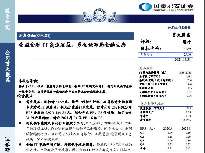 首次覆盖,目标价 31.59 元,给予“增持”评级。公司作为金融领域专业财税 IT 服务商,将充分受益行业发展。预计公司 2021-2023 年 EPS 分别为 0.92/1.12/1.36 元,综合考虑 PE、PS 估值法,给予公司 31.59 元目标价,对应 2021 年 34 倍 PE、6 倍 PS。l 用友旗下稳健成长的行业控股子公司。用友金融于 2004 年成立,2016 年挂牌新三板,为金融行业提供软件产品和服务。近年来收入、利润保持稳健增长,目前约 70%收入来自银行、证券/基金/期货两大业务板块,客户积淀深厚。l 金融 IT 市场空间广阔,内部竞争格局迥异。金融机构对信息系统的稳定性、性能有着严苛要求,因而金融 IT 行业具有高壁垒、强黏性,特别是在核心业务系统上。目前,银行 IT、资本市场 IT、保险 IT 呈现不同的商业模式与竞争格局,未来市场空间与机遇广阔。用友金融具体受益于四方面驱动因素:市场环境与监管环境变化、会计准则与税务政策变动、新增金融机构、技术变革。