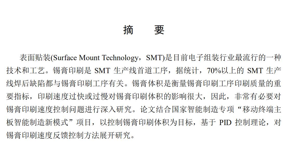 表面贴装(Surface Mount Technology,SMT)是目前电子组装行业最流行的一种技术和工艺。锡膏印刷是 SMT 生产线首道工序,据统计,70%以上的 SMT 生产线焊后缺陷都与锡膏印刷工序有关。锡膏体积是衡量锡膏印刷工序印刷质量的重要指标,印刷速度过快或过慢对锡膏印刷体积的影响很大,因此,非常有必要对锡膏印刷速度控制问题进行深入研究。论文结合国家智能制造专项“移动终端主板智能制造新模式”项目,以控制锡膏印刷体积为目标,基于 PID 控制理论,对锡膏印刷速度反馈控制方法展开研究。
