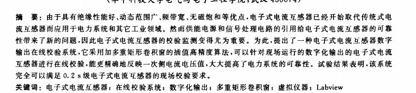 于具有绝缘性能好、动态范围广、频带宽、无磁饱和等优点,电子式电流互感器已经开始取代传统式电 流互感器而应用于电力系统和其它工业领域。然『|ii供能电源和信号处理电路的引用给电子式电流互感器的可靠 性带来了新的问题.因此电子式电流互感器的校验监测变得尤为重要。为此,提出了一种电子式电流互感器数字 输出在线校验系统,它采用加多重矩形卷积窗的插值高精度算法,可以针对现场运行的数字化输出的电子式电流 互感器进行在线校验,能更精确地反映一次侧电流电压值。大大提高了电力系统的可靠性。试验结果表明,该系统 完全可以满足0.2 S级电子式电流瓦感器的现场校验要求。