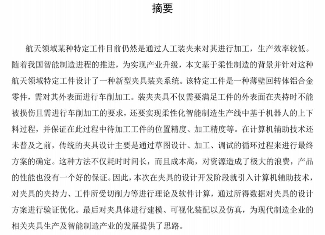 航天领域某种特定工件目前仍然是通过人工装夹来对其进行加工,生产效率较低。随着我国智能制造进程的推进,为实现产业升级,本文基于柔性制造的背景并针对这种航天领域特定工件设计了一种新型夹具装夹系统。该特定工件是一种薄壁回转体铝合金零件,需对其外表面进行车削加工。装夹夹具不仅需要满足工件的外表面在夹持时不能被损伤且需进行车削加工的要求,还要实现柔性化智能制造生产线中基于机器人的上下料过程,并保证在此过程中待加工工件的位置精度、加工精度等。在计算机辅助技术还未普及之前,传统的夹具设计主要是通过草图设计、加工、调试的循环过程来进行最终方案的确定。这种方法不仅耗时时间长,而且成本高,对资源造成了极大的浪费,产品的性能也没有一个好的保证。因此,本次在夹具的设计开发阶段就引入计算机辅助技术,对夹具的夹持力、工件所受切削力等进行理论及软件计算,通过所得数据对夹具的设计方案进行验证优化。最后对夹具体进行建模、可视化装配以及仿真,为现代制造企业的相关夹具生产及智能制造产业的发展提供了思路。