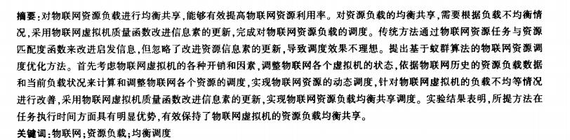 对物联网资源负载进行均衡共享,能够有效提高物联网资源利用率。对资源负载的均衡共享,需要根据负载不均衡情 况,采用物联网虚拟机质量函数改进信息素的更新,完成对物联网资源负载的调度。传统方法通过物联网资源任务与资源 匹配度函数来改进启发信息,但忽略了改进资源信息素的更新.导致调度效果不理想。提出基于蚊群算法的物联网资源调 度优化方法。首先考虑物联网虚拟机的各种开销和因素.调整物联网各个虚拟机的状态.依据物联网历史的资源负载数据 和当前负载状况来计算和调整物联网各个资源的调度,实现物联网资源的动态调度。针对物联网虚拟机的负载不均等情况 进行改善,采用物联网虚拟机质量函数改进信息素的更新,实现物联网资源负载均衡共享调度。实验结果表明.所提方法在 任务执行时间方面具有明显优势,有效保持了物联网虚拟机的资源负载均衡共享。