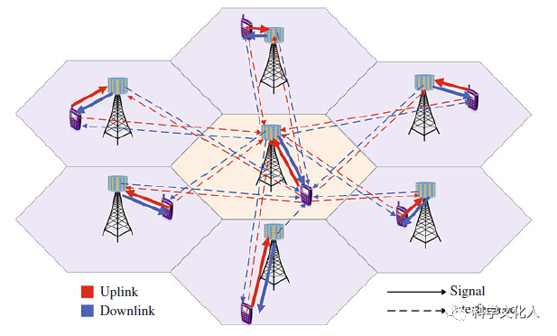 信道估计在通信系统中占据重要地位,估计准确与否,会对系统性能产生深刻影响,尤其是在信道译码器无法抵抗由于信道估计误差过大带来的影响。首先,massive MIMO系统具有大规模天线阵列,对应的信道响应符合一定的大数定律(LLN)。其次,目前massive MIMO采用的是TDD技术。该技术不同于FDD技术,具有信道互易特性。TDD技术的研究仍然具有挑战性。最后,massive MIMO系统的导频污染问题仍未解决。当在一个小区中使用正交导频序列,而在小区之间使用相同的导频序列组时,就会出现这个问题。产生这个问题的主要原因是,当用户使用同一组训练序列或非正交训练序列时,相邻小区的用户发送的训练序列是非正交的。因此,基站估计的信道不是本地用户与基站之间使用的信道,而是被其他小区用户发送的训练序列污染的信道。图1显示了因多小区造成的导频污染的场景。