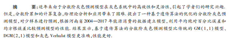 近年来由于分数阶灰色预测模型在灰色系统中的高效性和灵活性,引起了学者们的研究兴趣. 但是,分数阶累加的计算复杂,给理论分析和应用带来了困难.提出了一种基于遗传算法的优化的分数阶灰色预 测模型,对少样本进行预测,根据河南省 2004—201 7 年能源消费的数据建立模型,利用平均绝对百分比误差和 均方根误差比较预测模型的性能.结果显示,基于遗传算法的分数阶灰色预测模型比传统的 GM(1 ,1 )模型、 DGM(2,1 )模型和灰色 Verhulst 模型更准确,性能更好.