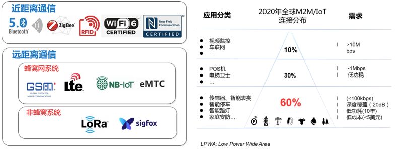NB-IoT是英文Narrowband Internet of Things(窄带物联网)的缩写,属于低功耗广域网(LPWAN ,Low Power Wide Area Network)的通信技术,NB-IoT通过优化网络协议、采用超窄带设计、半双工模式、重传机制和PSM节能模式等优化技术,使之具有广覆盖、低功耗、低成本、大连接的特点,广泛应用于低速率、无语音、电池供电、移动性要求不高的物联网场景,据GSMA预测,未来60%的物联网应用将集中于此类场景。